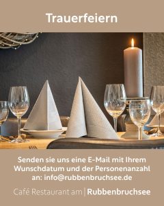 Ab 10 Personen senden Sie uns bitte eine Anfrage an veranstaltungen@rubbenbruchsee.de. Reservierungen für die Terrasse sind nicht möglich.